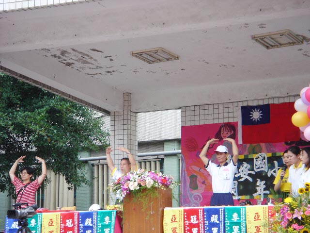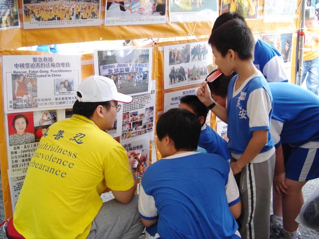【明慧网2005年5月9日】2005年5月7日是台湾台北县民安国小44周年的校庆,在下了一整夜的大雨后,天空开始放晴,晴朗的天空带着凉爽的微风。这次的运动会校方特别为法轮功团体安排了一个摊位,在摊位上不时有学童及家长前来认识法轮大法,学员们对活泼的小朋友也相当有耐心的一一讲解图片上的故事,带着小朋友念着中的诗句,小朋友也很开心的在镜头面前高兴的呼喊法轮大法好。