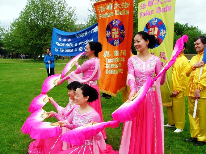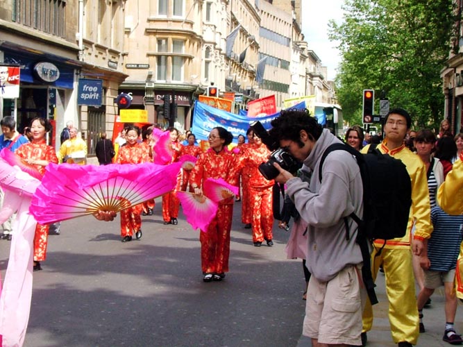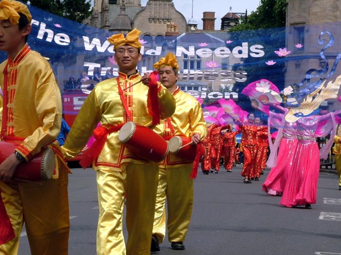 庆典游行于中午时分开始,整个游行队伍浩浩荡荡的穿过牛津城的市中心,途中经过了繁华热闹的步行商业街和牛津市政厅。热闹的游行队伍中,别具东方风采的法轮功团队颇为引人注目。法轮功队伍由手持“真、善、忍”三个大字的小弟子们领队,紧随的是“法轮大法好”的横幅。其后是两只雄风奕奕的狮子表演舞狮,然后是具有中华传统民俗色彩的腰鼓队及绸扇舞队,“世界需要‘真、善、忍’”和“法轮大法洪传全世界六十多个国家”的中英文横幅,以及色彩鲜艳的法轮旗,穿插在队伍中,颇显气势。舞绸扇的学员们随着“法轮大法好”的歌声翩翩起舞--“法轮大法好,法轮大法好,法轮大法是正法,佛光普照。”优美的歌声回响在牛津古城的街道上,也将大法弟子的心声传送给了牛津市民和远道而来的游客。精神抖擞的腰鼓队,温文尔雅的绸扇舞,凛凛正气的法轮大法横幅,法轮功学员的精神风貌给沿途观众留下了深刻的印象。队伍所过处,不时有阵阵掌声响起。