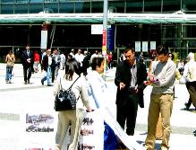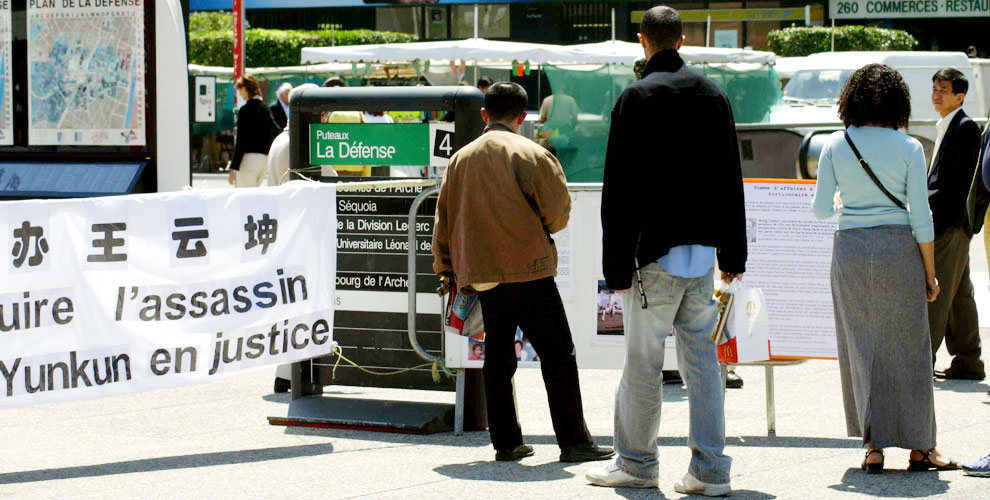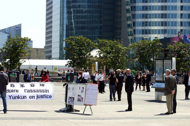 中午时分,一个参加汽车工业大会的法国人兴冲冲的走到信息桌前,他说他早晨拿了传单和起诉王云坤的新闻公告,他觉得应该让更多的法国同事知道,于是拿了几张放到大会的咖啡厅里。学员同时请他转告王云坤:如果他还不明白法轮功,请他到法轮功的网站上去了解。如果他知道法轮功是什么,叫他不要继续迫害法轮功了。他连连点头答应了。真是个明白人。