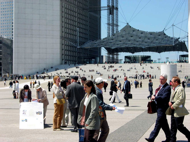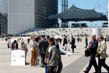 这里法国和世界级的大公司很多,上下班高峰期间和午餐时间白领阶层人潮如流。尽管他们步履匆匆,但法轮功学员的横幅和展板吸引了他们的视线。很多人接传单,有的边走边看起来,有的向学员询问详情,有的签名表示支持法轮功学员、反对迫害。