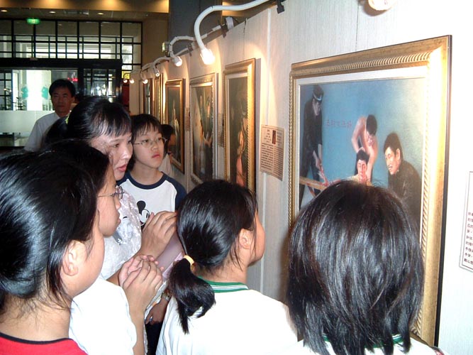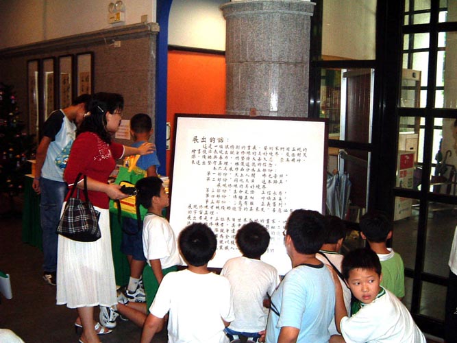 在参观画展前,我事先将美展DM资料及校外参观通知单钉在学生的联络簿上,也顺道邀请家长一起参加。在参观的前一天,我先将美展画作及展出缘由用电脑介绍一遍给孩子了解,并发下和同修一起设计的美展学习单作讲解。参观当日并要求学生携带美展学习单及笔以利完成当日学习单作业。事实上通过美展DM、校外参观通知单的说明,并要求学习单完成后要让家长检阅签名,也起到让孩子对家长讲真象的效果。