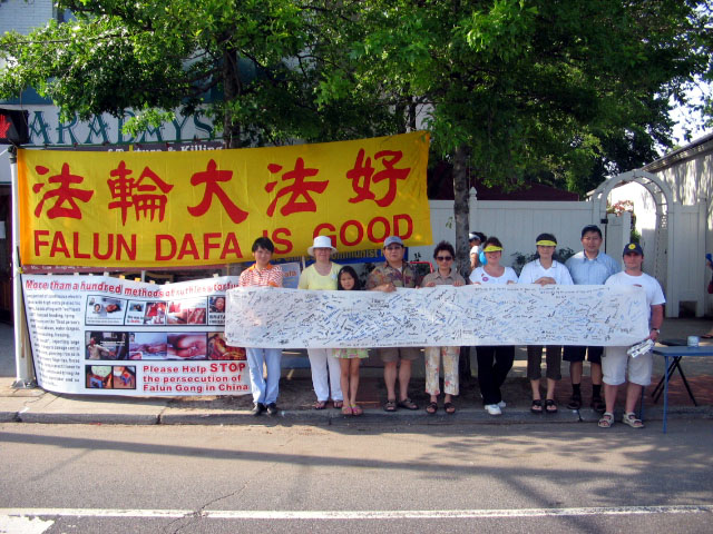 学员也摆放了摊位,并挂上“法轮大法好”的横幅;横幅下边是揭露法轮功在中国受迫害的图片和说明;横幅的旁边放了一张桌子,上面放着一块用于签名的白色长布。有的学员发正念,有的发真象资料,有的炼功,有的向前来街市的民众讲真象。