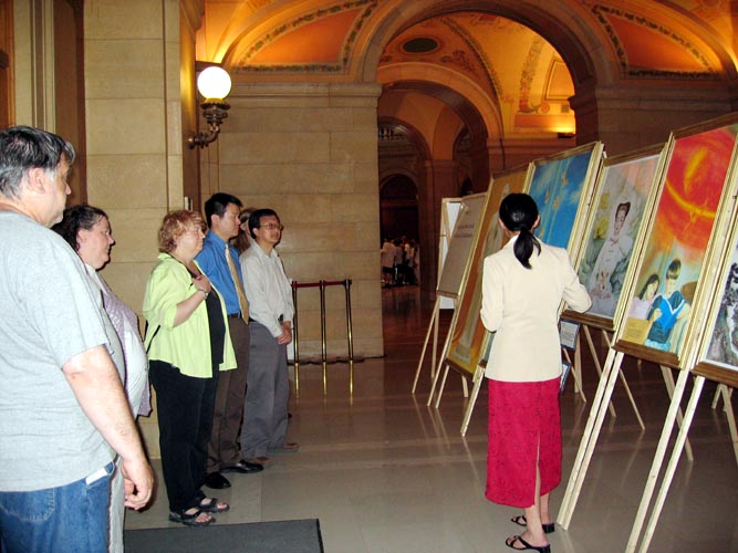 一位在政府部门工作的韩国女士,在休息时间下来观看画展。这位女士以前没有听说过法轮功,明白了真象后,跟学员们索要了所有种类的资料,还把每一幅画认认真真的看了一遍。当她看到《火烧炮烙》,《老虎凳》,《对妇女的迫害》,《灌食》等画时,她说:真不敢想象在中国现在还发生这样的事,这比希特勒的酷刑残酷好几倍,希特勒只能站到一边去。她说:她回去以后,会读所有的资料,还会看法轮功的网站。