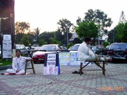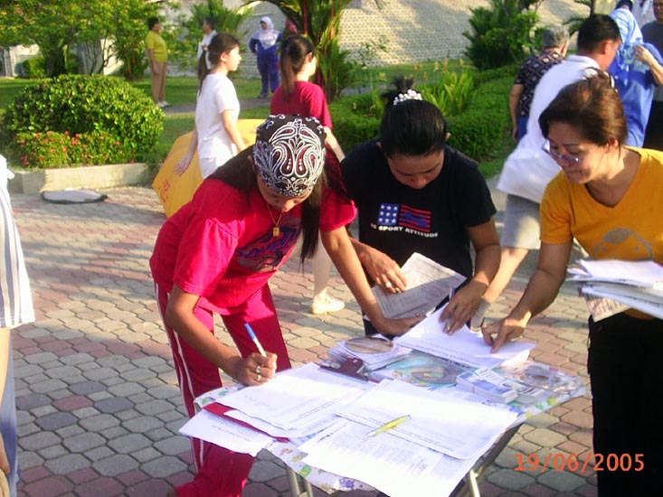 【明慧网2005年6月23日】为了让人们進一步了解中共对法轮功的目前还在延续着,马来西亚法轮功学员定于2005年6月19日早上,再次到人潮众多的雪兰莪州吧生市人民公园举行反展。在此之前,学员写了书信通知当地市政府。当学员去提交书信时,市政局的公关小姐一下就认得学员。学员跟公关小姐提起我们要再一次于人民公园办反酷刑展。公关小姐很开心的接收了书信。