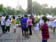 反酷刑展于当天早上约七点正开始。跟以往一样,学员选择在公园的正门口以真人模拟演示中共用于迫害法轮功的酷刑,同时也摆了真象展板,派发真象资料和進行征签活动。开始时,来公园运动的民众跟以往一样多,可是前来了解真象的人们却不多。不禁让人疑惑,难道来公园来运动的人们都知道了真象?无论如何,学员们本着无论有多少的人,也要尽量让他们了解中共迫害法轮功的事实真象,而且迫害目前还在发生着。