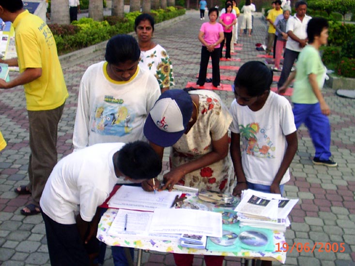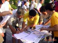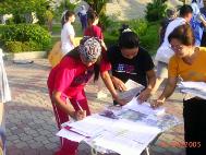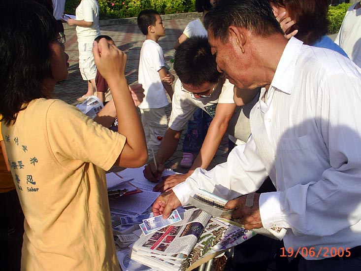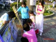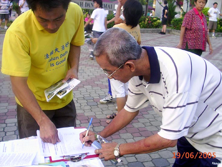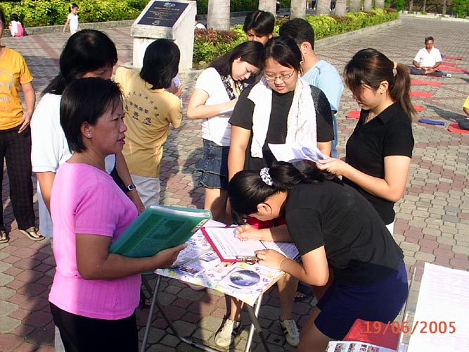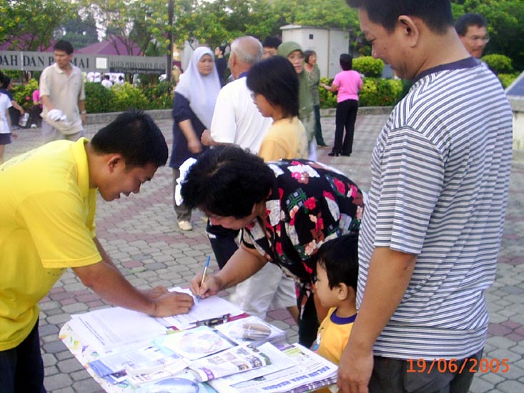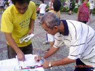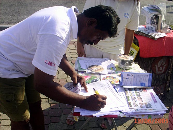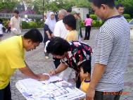 前来了解真象的民众马来西亚是个宗教信仰自由的国家,所以绝大多数的人民都有信仰,而且都相信善有善报,恶有恶报。当善良的人们无论男女老少,无论是任何种族:华人、马来人或者是印度人,当他们知道了中共运用毫无人性的手段迫害只为坚信“真善忍”的法轮功学员后,他们都毫不犹豫的纷纷签名反对中共对法轮功的迫害。有些人还谴责共产党真是没人性,什么事情都敢干。