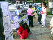 早晨的太阳愈来愈炽热,但却驱不散想要了解真象和想要签名支持法轮功的民众。这好比中共迫害法轮功的邪恶手段一一曝光在阳光下,最终使广大世人了解了真象。