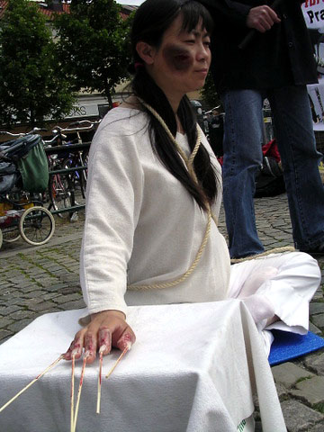 隆德是瑞典南部的一座小城,但历史悠久,素有“大学城”之誉。这是学员们第一次在此举办反酷刑展。活动刚开始不久,一位中国留学生走了过来,饶有兴致的观看展板并开始提问,一位学员耐心的向他讲着真象。像许多来自中国大陆的民众一样,他不知道六年以来,在中国发生着的迫害如此残酷。他问了许多问题,索取了各种真象资料、光盘,并留下了自己的地址,希望学员给他寄一张教功的光盘。临走前,他高兴的说:来此一年多了,听说在马尔默有炼法轮功的,去过几次,都没有找到。今天,能在这儿见到你们,真是太巧了! 原来,他与朋友原计划去野炊,后来听到天气预报说今天会有大雨,便取消了计划,他才得以到广场来。