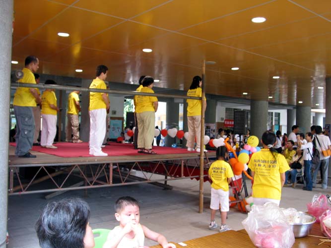 发表会的一开始即为法轮功学员的功法表演,同时并有功法的说明与讲解,民众非常专注的看着优美五套功法表演,也被缓、慢、圆的动作与柔和的炼功音乐所吸引,纷纷至法轮功摊位索取资料,询问哪里可以学炼功法。