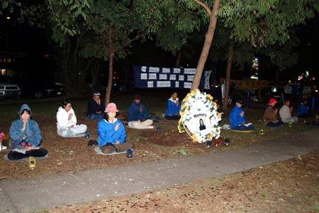 那天是澳洲入冬以来最冷的一天,刚刚下过雨,寒风凛凛,夜幕早早降临。学员们点起蜡烛,在寒风中展示功法、静坐、发资料、放真象影片。