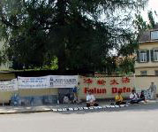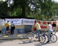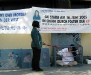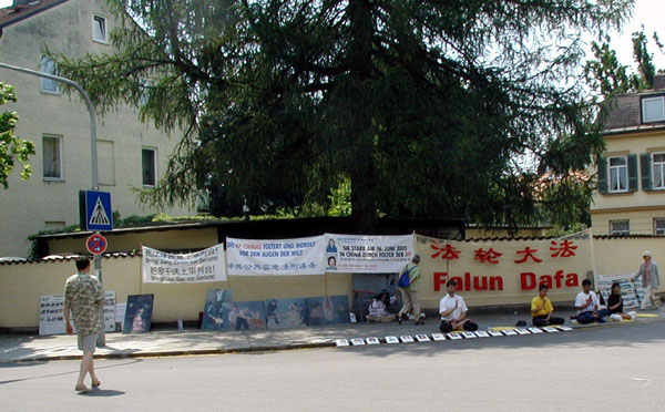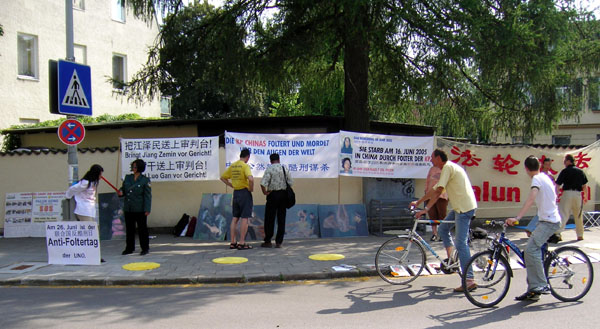这一天是联合国反酷刑日,慕尼黑和周边地区的法轮功学员来到德国慕尼黑中领馆前進行抗议,抗议中共6年来对法轮功学员实行的群体灭绝的残暴镇压,对法轮功学员实施超过一百多种酷刑的极其凶残的行为,呼吁立即停止迫害。法轮功学员打出“把江泽民送上审判台”“中共公然实行酷刑谋杀 高蓉蓉于2005年6月16日被迫害致死”等中德文横幅和高蓉蓉的照片,摆放了介绍大法洪传、揭露迫害真象的展板以及表现恶警正在对法轮功学员实行酷刑的油画。
