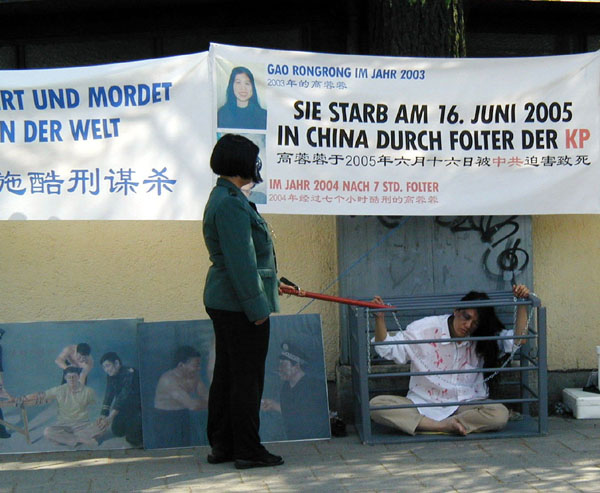 这是2005年6月26日发生在德国慕尼黑中领馆前的一幕。这也是法轮功学员首次在中领馆前展示酷刑,模拟恶警电击高蓉蓉脸部的场景。