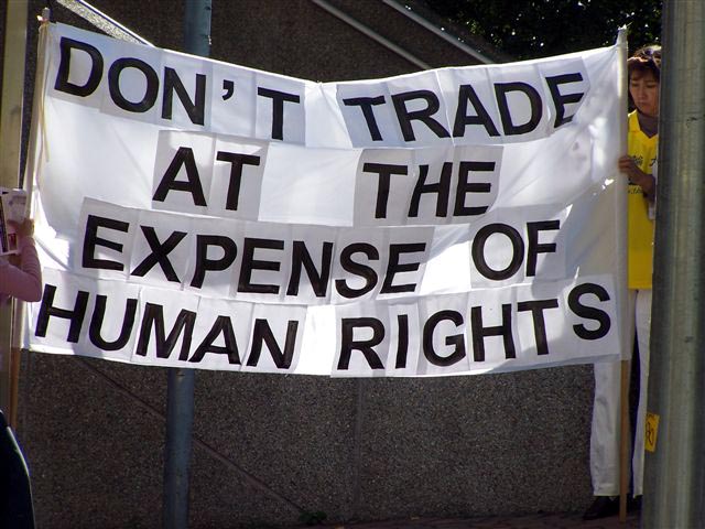 ![]() 横幅上写着:唐纳先生,不要帮助中共迫害法轮功 | ![]() 不要以牺牲人权来进行贸易 | ![]() 不要限制法轮功学员的言论自由 |