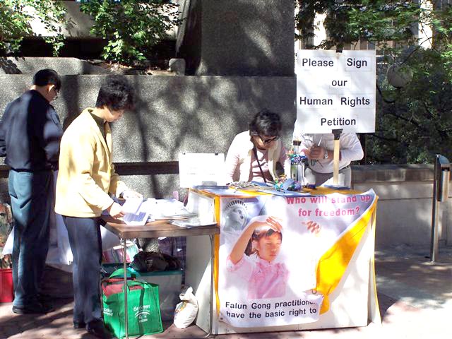人们也震惊于高蓉蓉之死,以及她因炼法轮功而遭受的非人折磨。许多行人在请愿书上签了名,索取法轮功及迫害的资料,并致以良好的祝愿。我们也送给外交外贸部一套资料,并解释我们为什么在外面举行这次活动。