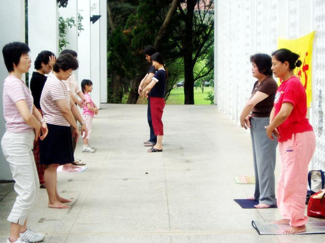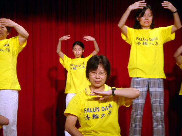 比较特别的有一位职员,之前曾陆续参加过几堂社团课程,虽然也看过二遍《转法轮》但仍表示暂时无法接受法轮功。却在一次社团邀请陈彦玲教授来校演讲后,每天清晨都到校园一起炼功,现在已经看《转法轮》三遍了。功法表演当天,连她自己都非常感动大法带给她的力量,她说她会说服她先生也一起来炼。