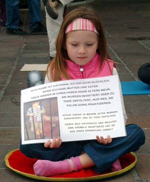 在参加了周末的反酷刑展后她特别希望也能参加表演来告诉路人,在中国孩子们也会受到迫害,仅仅因为他们或他们的父母修炼法轮功,按真善忍做个好人。学员们特地为她打印了《为什么》这幅油画,画中的小男孩带着伤痕和妈妈一起被非法关押在牢笼里,他的神情似乎在问,这一切是为什么?在画边写上了说明,告诉人们在中国孩子们受到的种种迫害和卡塔琳娜的心愿。每次演反酷刑展时,卡塔琳娜就会拿着图片在醒目的位置打坐,为国内的小同修请愿。
