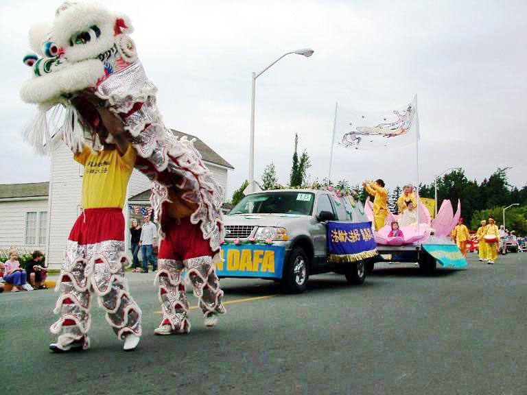仅仅在一年多前, 三皇岛上一位年轻人在网上发现了法轮大法的信息,从此开始自学大法。 很快,他的家人和朋友们便认识到他所学习功法的重要意义。今天,岛上已经有一小组并迅速扩大的人群在学习大法。这些新学员们常常与华盛顿州其它地区和俄勒冈州的学员们共同在三皇岛屿上传播大法。我们的游行给岛上的居民带来了巨大的震撼力。