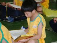 一年半的时间,公开招收了2次的社员,我们利用招生简介讲真象,把大法洪传、迫害的真象清楚的传递给全校师生、家长。我们几个人分组,一个礼拜三次,利用中午50分钟午休的时间,带领孩子学法、炼功。这些孩子来自各年段各班,从7到12岁都有,虽然年龄层不同,但学法、炼功同样没问题。