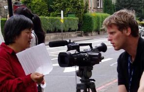 更巧的是,这名冰岛国家电视台记者,在2002年6月江泽民访问冰岛时,他是当地的一名警察;他就是那时开始听说法轮功的。那时,冰岛政府由于对法轮功不了解,受中共的造谣诬蔑宣传和压力的影响,曾一度拒绝来自世界各地的法轮功学员入境;该事件引发冰岛民众的大规模抗议;冰岛媒体在头版刊登冰岛民众向法轮功学员的致歉。学员们努力向冰岛政府讲清法轮功真象和遭中共系统性残酷迫害的事实;后来,法轮功学员们堂堂正正的入境冰岛。这名记者此次来英国采访G8,又遇到法轮功学员在中领馆前的和平请愿,于是采访了法轮功学员。