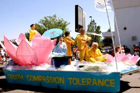 记者还注意到当这独特的花车经过时,两旁的观众一下子静了下来,人们凝视着花车:“真、善、忍”、“法轮大法”横幅,还有花车上身穿中国式宽松服装的美国面孔在祥和宁静的打坐。