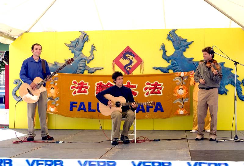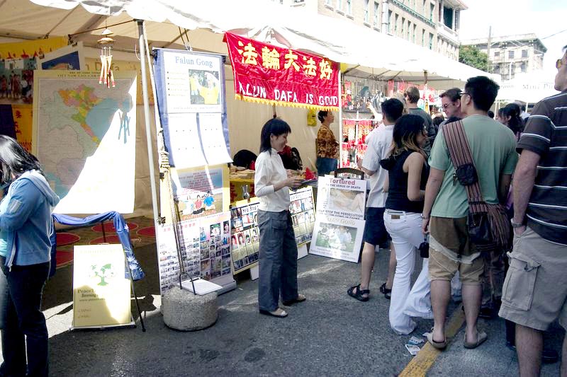 在法轮功展位上,观看展板的游人众多。许多华人父母把图片上大陆学员被迫害的真象解释给年幼的孩子听。一位从广州来的中国人与学员交谈了一个半小时。他最后说,以前被中共迷惑了,今天看了展板,又听到学员的解答,终于明白了。
