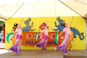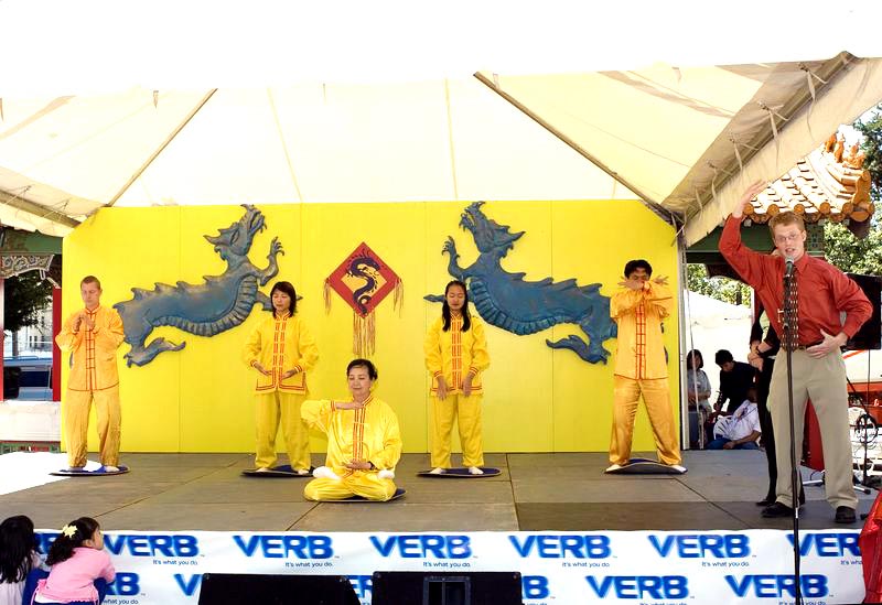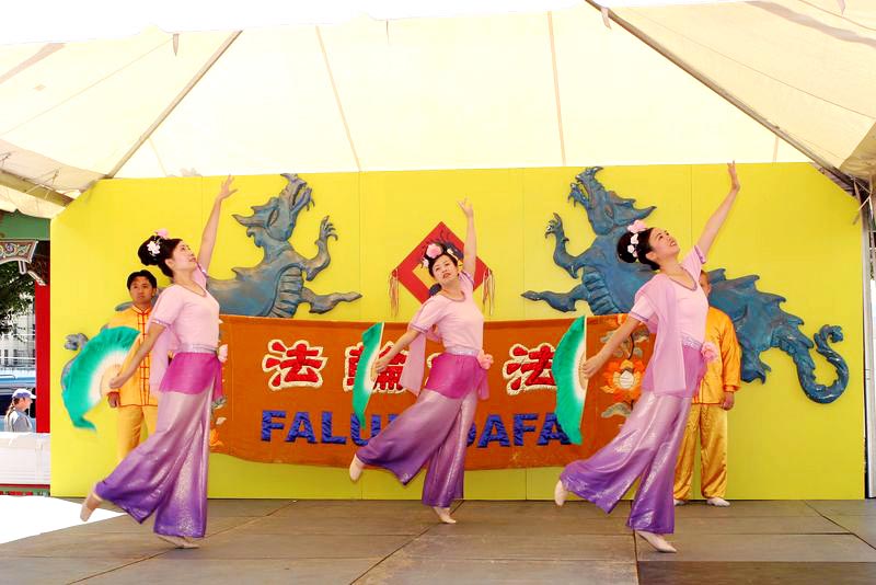夏日庆典的中心焦点设在中国城的小公园。二十多个亚洲族裔团体轮番上台表演。今年来自华盛顿州各地的法轮功学员们在“龙的舞台”上再展风采。半小时的节目吸引了众多华人和西方人观众。