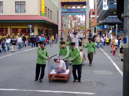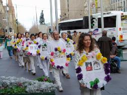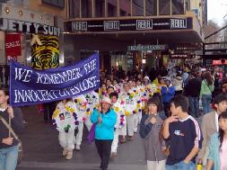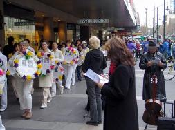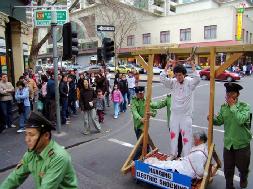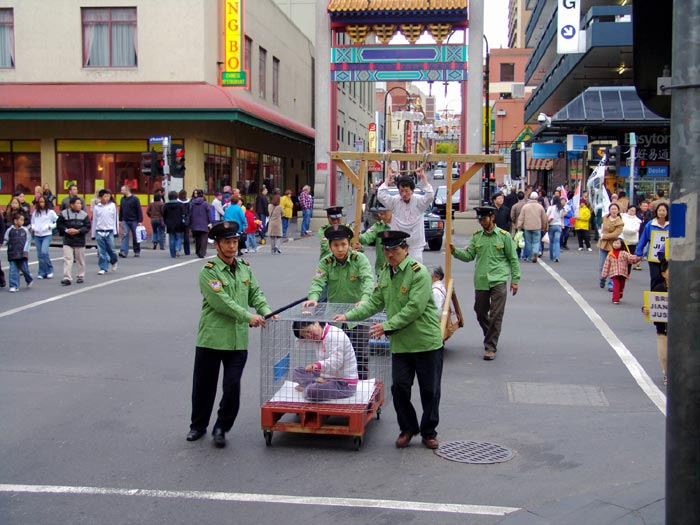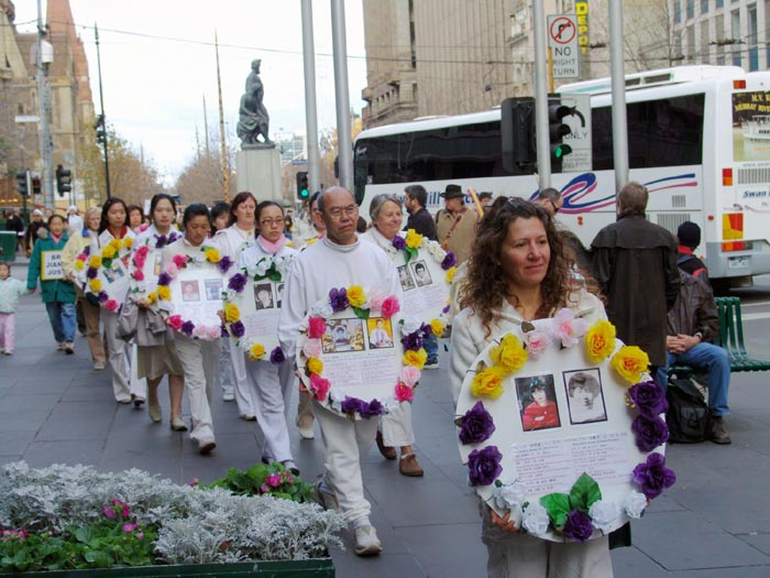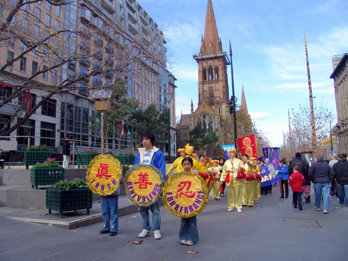 中午12点学员们开始了穿越市中心包括唐人街的游行。三个手持“真、善、忍”牌匾的孩子走在队伍的最前面,紧随其后的是腰鼓阵和七面赤、橙、黄、绿、青、蓝、紫的旗队,然后是身着白色服装,手持花圈悼念在中国被迫害致死的同修的法轮功学员们,再后面就是真人模拟酷刑演示及“诉江”的队列。