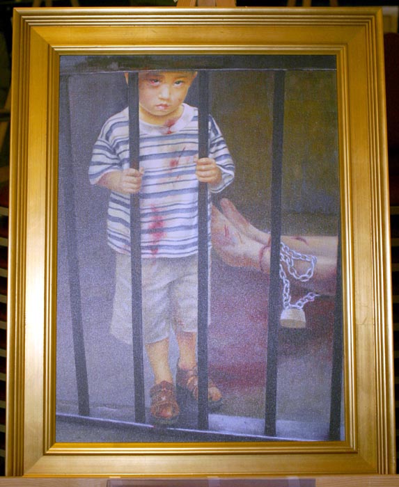 其中一幅油画—《爸爸回来吧》,体现的是:小法度—她的爸爸因为修炼法轮功被中共迫害致死,几年来,她跟着妈妈走遍了世界许多地方,向人们讲述爸爸的遭遇。看着画,令记者感受到:小法度的呼喊—“爸爸回来吧!”;妈妈告诉小法度:“在中国,还有不少人象爸爸那样,受到迫害,却没有人知道。”