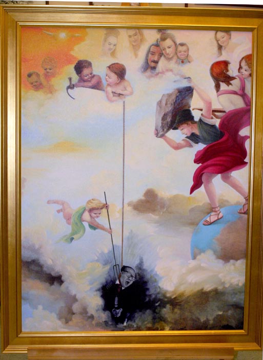 ![]() 江泽民一手发起对上亿真善忍修炼者的残酷迫害,令人神共愤;有的观众看到此画,忍俊不禁,捂着嘴笑。 |