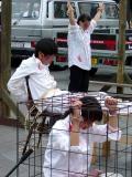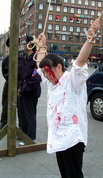 扮演受迫害学员的另一位大法弟子,是在丹麦获得博士学位,如今从事科研工作的工程师林女士。她说:长时间坐在铁笼子里,或者演示吊刑,虽然与中国的受迫害同修所遭受的痛苦是没法比,但身体还是要付出比较大的承受。我愿意用自己的承受,来唤醒人们的正义,良知,早日结束这场迫害。