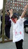 法轮功学员遗孤刘晓天,如今已是走在正法修炼路上的大法弟子,今天他再次扮演受迫害的法轮功学员,他说:我的爸爸妈妈,是在这场迫害中失去生命的,我也因此成了孤儿。今天我在这里向人们展示国内的法轮大法弟子们所遭受的痛苦,是希望能够使这场迫害早日结束,使大法弟子的孩子们,有自己的幸福家庭,使我所遭受的悲剧不再重演。