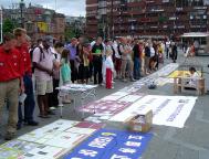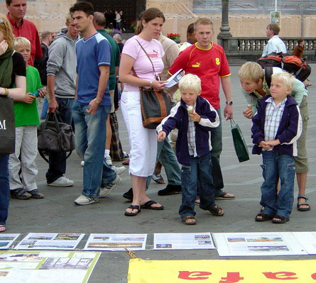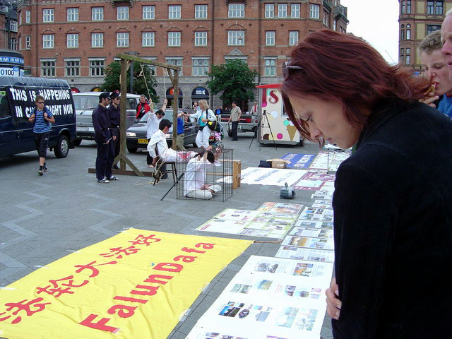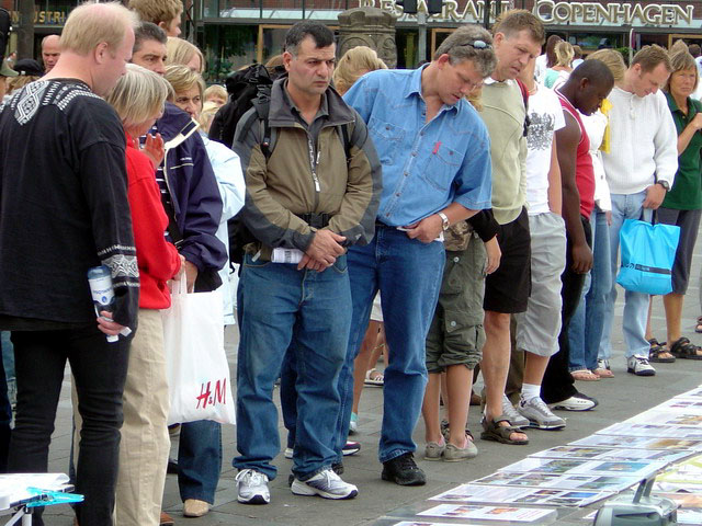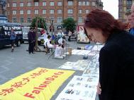 7月16日下午,部份丹麦、瑞典法轮功学员在哥本哈根市最大的广场——市政厅广场,向世人展示发生在中国的这场惨绝人寰的群体灭绝迫害罪,和法轮大法弟子在“真善忍”修炼实践中所体现的和平、坚定风貌。