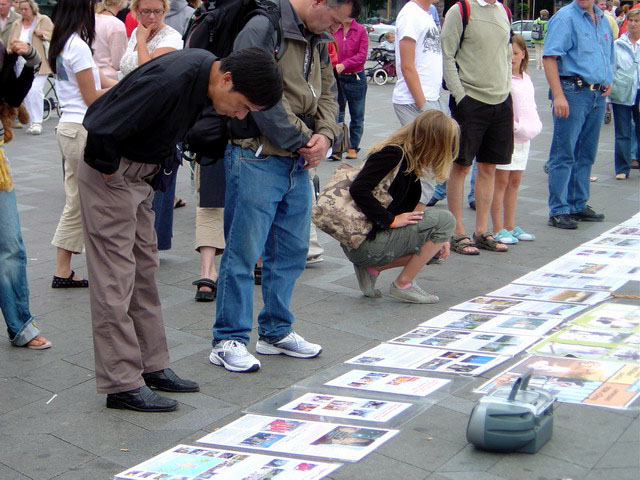 这些残酷的场面,详尽的叙述震惊了每一位过往的行人,在展示的整个过程中,围观的人群没有一刻减少过,仿佛一堵人墙。许多人长时间停留,仔细阅读图片上和法轮功学员们为“7.20”六周年所制作的传单,和多个学员交谈;许多人认真的倾听反复播放的酷刑展的解说词;许多人表达了他们对发生在中国的迫害的愤怒,对西方政界及媒体由于经济利益而保持沉默的批评与谴责;许多人拿出了照相机,摄像机,拍下这令人震惊的场面。