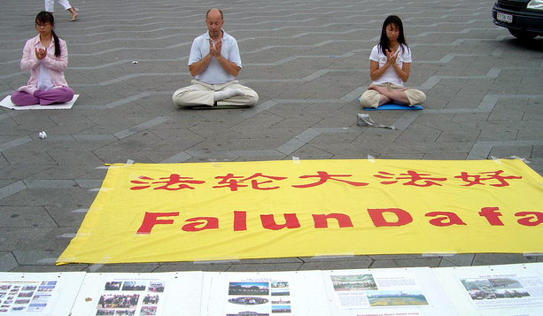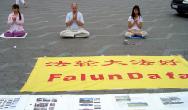 与此同时,在“法轮大法好”的横幅旁边,一些学员在炼功音乐声中,向人们演示功法,这祥和,舒缓的场面向人们展示大法的美好,许多人被音乐所吸引,被功法所吸引。有人得到了大法的音乐光盘,感激而去,有人向学员询问学习功法的时间,地点。