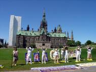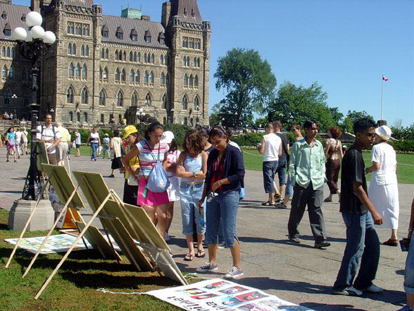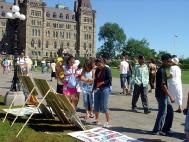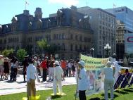 在人潮涌动的国会山前,草坪上一些身着白色的法轮功学员静静的打坐炼功,另一些则向过往的游客介绍法轮功,讲解真象。