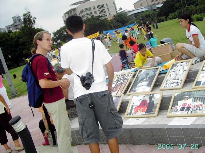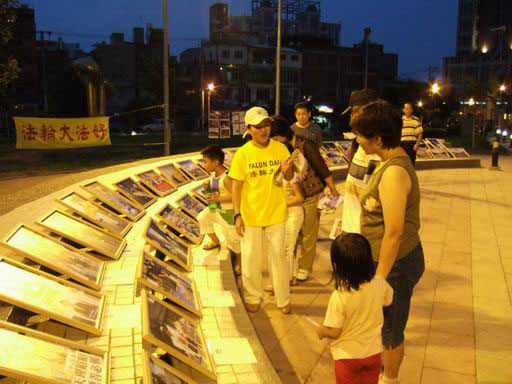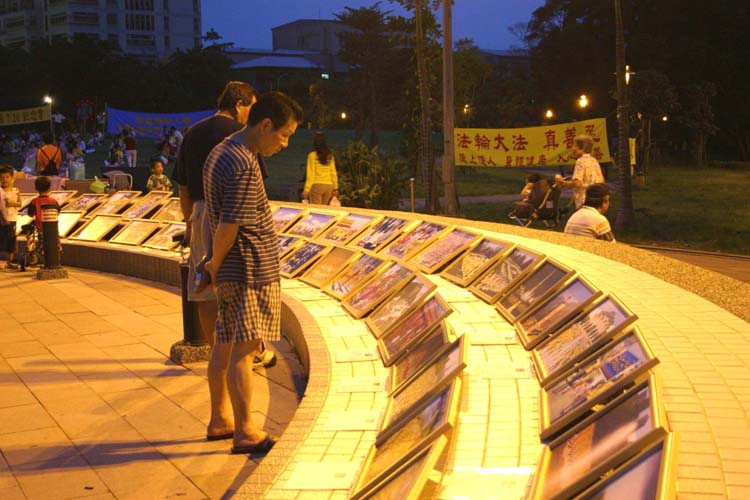 追悼会由下午四点开始的“法轮功真象摄影展”揭开序幕。许多来公园运动的民众,看到学员被迫害的真象照片,直喊真残酷;有些小朋友干脆就坐在相片前看得很专注;有些祖籍在大陆的老先生,看到法轮功洪传全世界的照片,不解的问:法轮功如果真的这么好,中共为什么要打压?在导览人员的解说下,他们明白了是因为共产党假恶斗的本质,容不下修炼真善忍的法轮功学员。