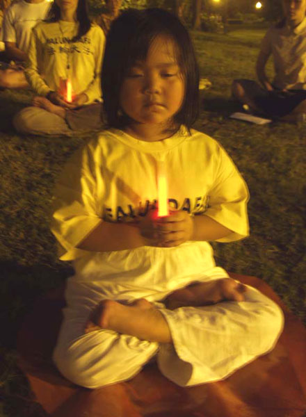 6:10分学员们聚集在草地上演炼五套功法,那祥和的景象,吸引了很多民众的目光,有些运动的人们,停下了脚步,跟着学员的动作就炼起功来了。7点10分悼念活动正式开始,两位学员代表致追悼词,接着点起烛光静默五分钟表示悼念;法轮功小弟子朗诵《洪吟》神情专注可爱;最后在法轮功学员组成的合唱团歌声中活动结束。