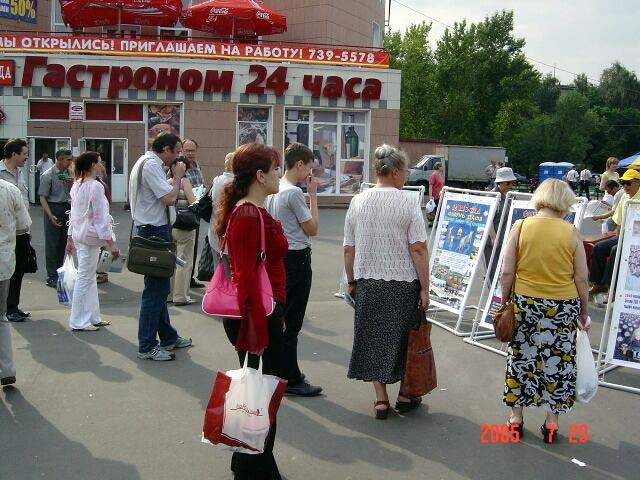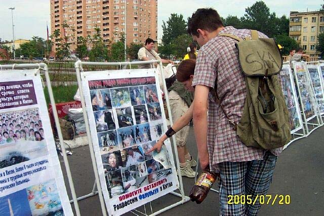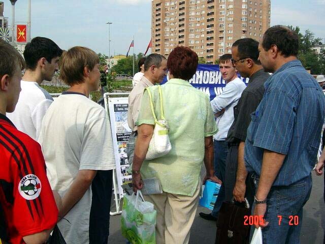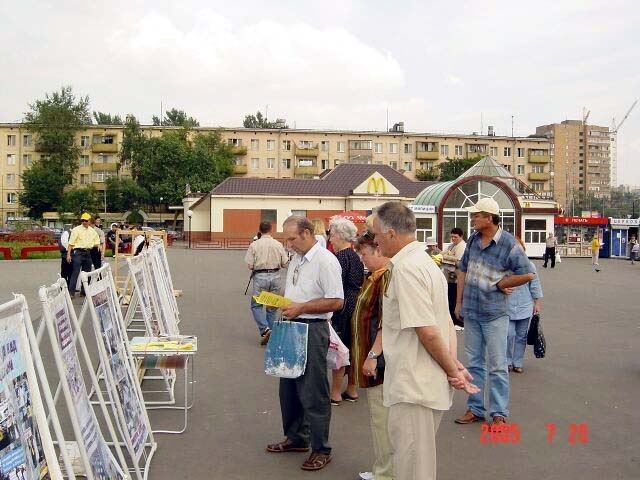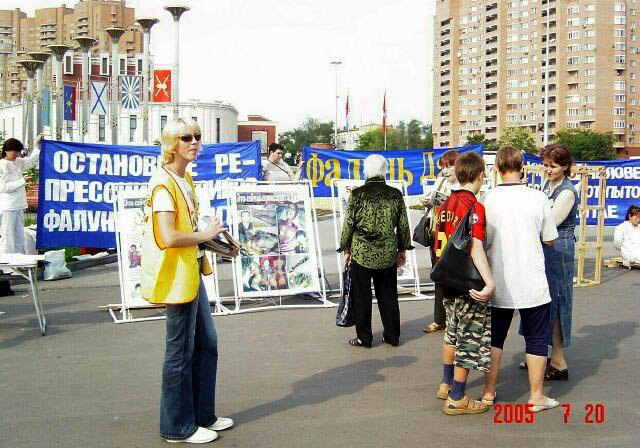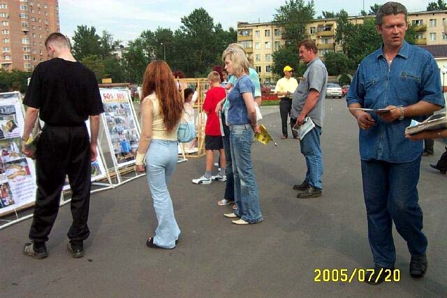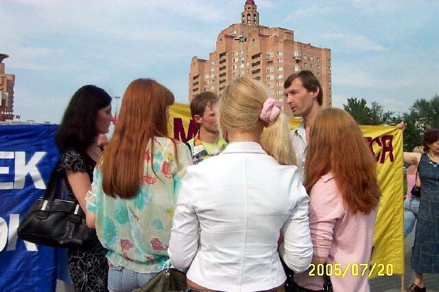 从1999年7月20日中共江氏集团开始镇压法轮功至今已经6年了。六年来中共恶党用欺骗和暴力不仅残酷的迫害修炼“真、善、忍”的法轮功学员,同时毒害着世人。法轮大法学员在遭到中共灭绝性的残酷迫害的艰苦环境下,一直坚持着和平理性的向世人讲真象。用自己的真诚和善良化解着邪恶的谎言,唤醒着人们的良知。俄罗斯是受中共党恶党谎言欺骗毒害比较深的地方,加之经济利益上的诱惑,环境更加复杂。俄罗斯法轮功学员克服来自各方面的干扰,利用一切机会向世人讲清真象。
