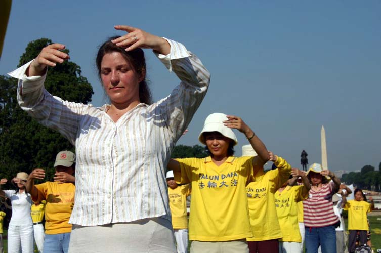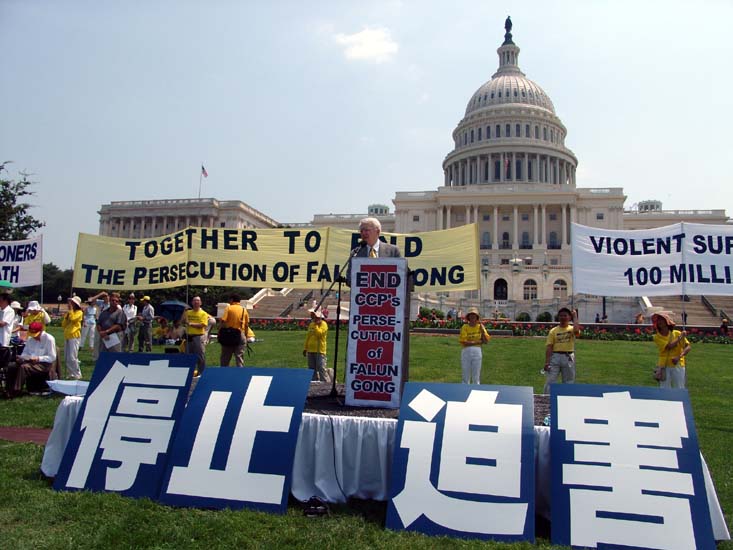 早上9点,在华府国会山庄的西草坪前,法轮功学员以大炼功,拉开了每年“7•20”在此的反迫害系列活动的序幕。中午时分,自由之家、法轮功之友、和法轮大法佛学会联合举办了集会游行;多位美国国会议员和著名人权组织领袖前来声援。