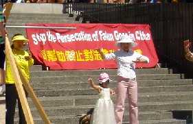 法轮功学员在温哥华艺术馆前举行了一系列活动。他们在艺术馆阶梯正中架起了“法轮大法好”、“中国正发生什么”、“请帮助制止对法轮功的迫害”的横幅,广场两侧摆放了几十幅“法轮大法光辉历程”的大型展板和营救孤儿的图片,广场正中学员们不停的在演示法轮功的五套功法,其中有70多岁的老弟子,也有几岁的小弟子。广场前面是真人模拟演示中共在大陆迫害法轮功学员的酷刑。道路两侧有学员在发放法轮功真象材料并向民众征签营救受迫害法轮功儿童的明信片。