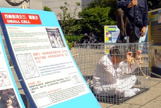 ![]() “吊刑”酷刑展示。 | ![]() “关小笼子”酷刑展示。 |