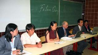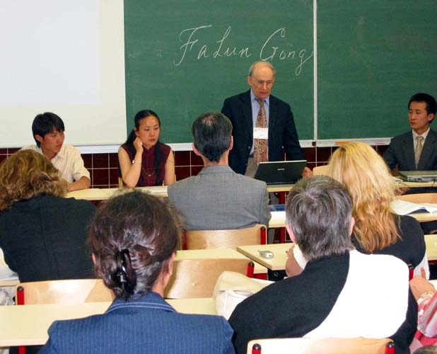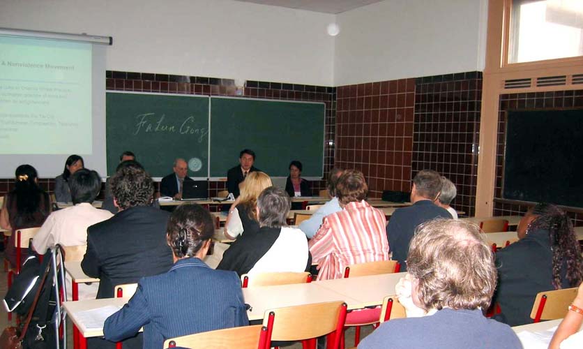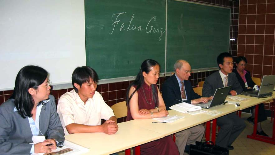 7月7日下午,在法轮功的专题研讨会发言的包括:法轮功发言人张而平先生,中国精神卫生观察(China Mental Health Watch)主席精神科医生盖利,台湾大学政治系明居正教授及三位在中国曾遭受精神迫害的法轮功学员:爱尔兰的赵明,法国的陈颖和丹麦的刘晓天。