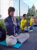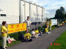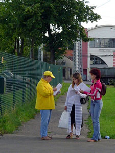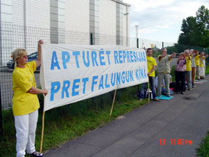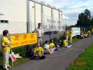 横幅上用拉脱维亚文写着“法轮大法 真、善、忍” 和“停止对法轮大法弟子的迫害”等字样。法轮功学员有的炼功、发正念,有的向行人发送真象传单。