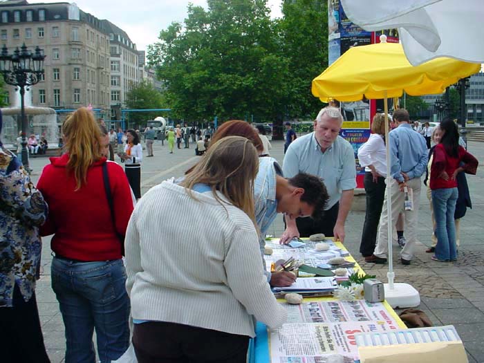 2005年7月23日,星期六,在德国国际金融中心法兰克福市老歌剧院前,由法轮功学员举办的“7•20”六周年,呼吁制止迫害的活动中,记者找到了答案。