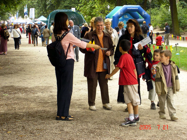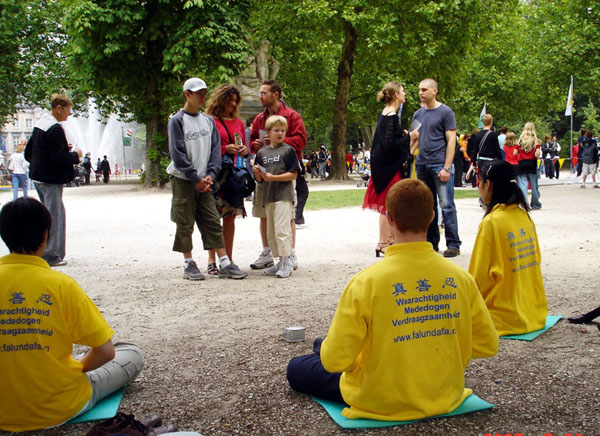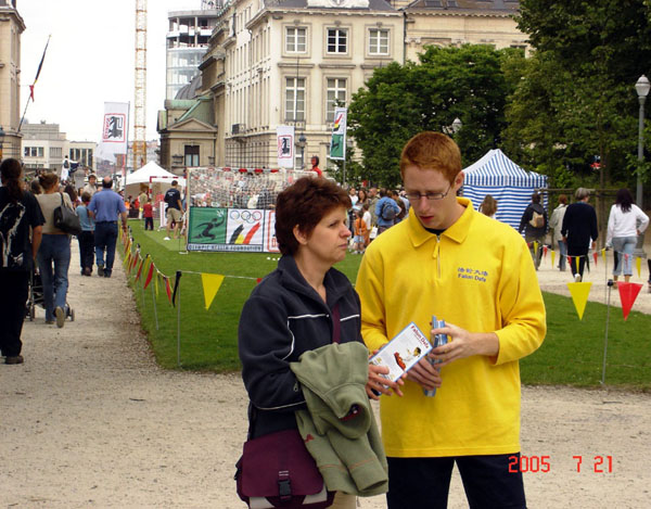 由于本年度是150周年的大庆,全国各地的游客都赶到布鲁塞尔参观游行。特别是市中心公园,各式各样的主题活动,以及比邻游行路线的地理优势,吸引了最多的人群。在人潮涌动的公园中心的空地上,法轮功学员分成两部份,一部份炼功,另一部份向过往游人散发传单。