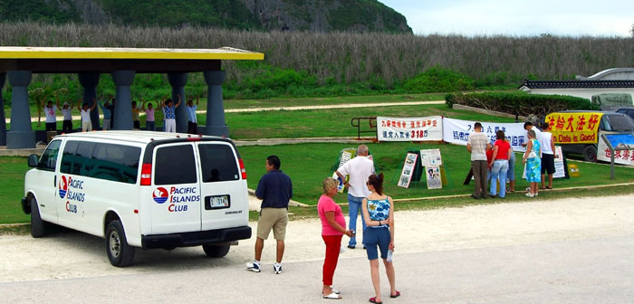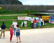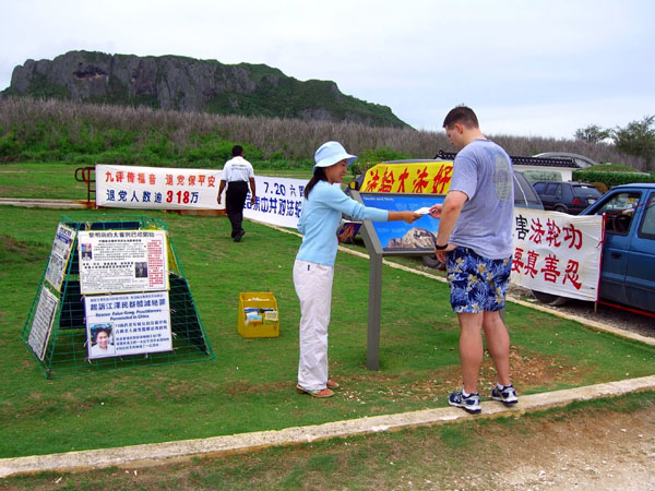 上午九点至十二点,塞班法轮功学员像往常一样在当地著名旅游景点摆出真象展板,挂起写着“停止迫害法轮功,世界需要真善忍”、“法轮大法好”、“7.20六周年,结束中共对法轮功的迫害”等横幅,同时播放《风雨天地行》法轮功真象光碟,并且集体炼功,用多种方式向过往游人展示法轮大法的美好,及洪传世界上78个国家和地区然而在中国却遭受迫害的真象。
