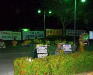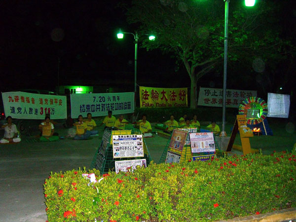 晚上六点半至十一点,在塞班移民局广场,学员们摆放花圈,点起蜡烛。以烛光悼念、炼功、集体发正念等形式表达着对同修们的追思,呼吁人们关注并共同制止中共对法轮功的迫害镇压。