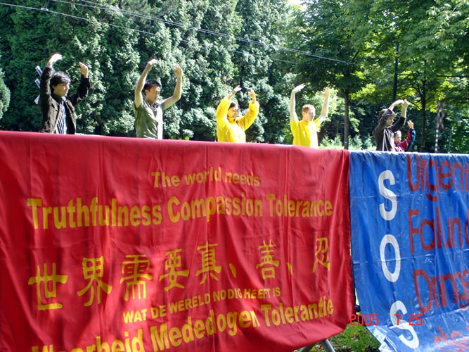 为抗议中共六年以来对法轮功的迫害,2005年7月25日,比利时部份法轮功学员到中国驻比大使馆门前举行和平抗议。