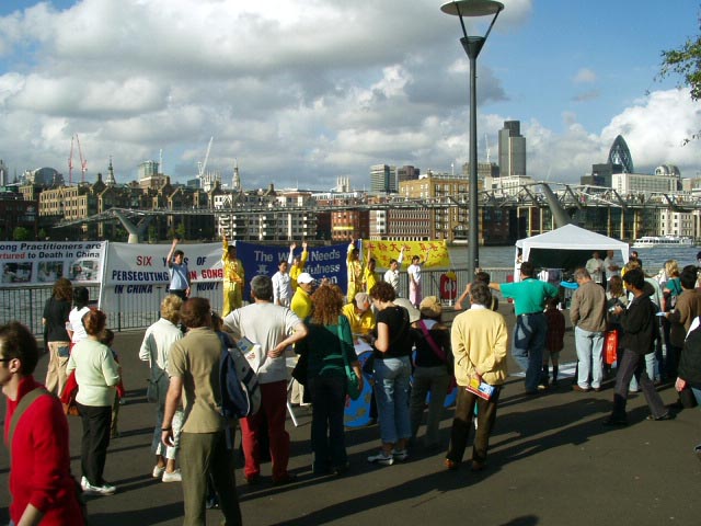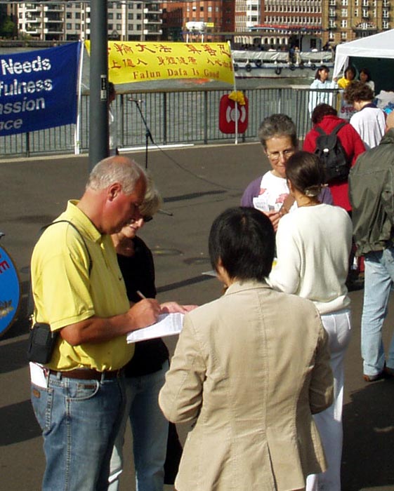 整个下午和傍晚,许多英国人和来自世界各地的游人在呼吁制止迫害法轮功的请愿信上签下了自己的名字表示支持。有位英国男士开始时说不了解,没有签名,但当他看了展示的图片、展板等真象资料后,他默默的走回到刚才那位学员那里,在呼吁书上签下了自己的名字。还有一位西人男士对学员说:“我在(美国)加利佛尼亚签过了,我支持你们!”