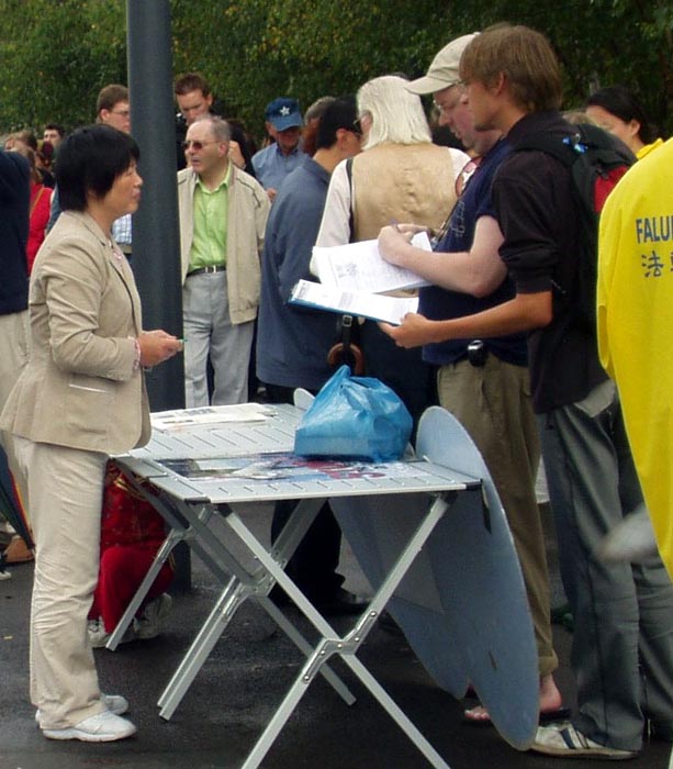 一位西人女士观看良久,她表示非常不理解,这么好的功法,中共为什么要迫害。当学员递给她真象资料,她问:法轮功是什么?中共出于什么原因和目地要迫害?海外政府、联合国有没有帮助制止这场迫害?……学员一一解答了她的问题。学员还告诉她,法轮功“真、善、忍”的基本原则,象照妖镜一样,对比照射出中共邪党的“假、恶、斗”本质,令邪党非常惧怕,加上邪党历来视中国人民的生命如草芥,故中共邪党与妒嫉成性的江××相互勾结迫害法轮功。学员还向她讲述了“天安门自焚伪案”的种种疑点,以及伪案背后,中共与江××构陷诬蔑法轮功的目地。女士感到非常震惊,她表示要了解更多的真象,学员答应给她寄去更多资料。